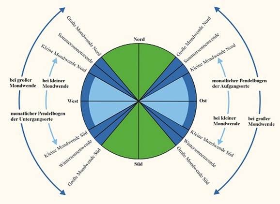 Der Mond wandert ähnlich wie die Sonne täglich von Ost über Süd nach West über den Himmel. Jedoch durchläuft er den gesamten Pendelbogen aller Auf- und Untergangsorte, den die Sonne halbjährlich zwischen den zwei Sonnenwenden abschreitet, bereits halbmonatlich zwischen den Extremständen der sogenannten Mondwenden. Die Mondwendeorte liegen in der Nähe der Sonnenwendeorte, jedoch verändern sie sich systematisch über einen Zeitraum von 18,61 Jahren. In manchen Jahren übertrifft der Mond in seinem nördlichsten Aufgang den Ort des Mittsommeraufgangs um bis zu 10° nach Norden und im südlichsten Aufgang den Ort des Mittwinteraufgangs um die entsprechende Spanne nach Süden. Sein Pendelbogen übertrifft dann den Pendelbogen der Sonnenaufgänge deutlich und man spricht von den Großen Mondwenden. In anderen Jahren jedoch erreicht er die Wendemarken der Sonne in seinem monatlichen Wendezyklus nicht. Dann ist sein Pendelbogen kleiner als der der Sonne und man spricht von den Kleinen Mondwenden.