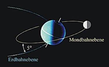Der Grund für diese zyklische Veränderlichkeit seines Pendelbogens ist in der Neigung der Mondbahnebene gegen die Ebene des Erdumlaufs um die Sonne zu finden. Die Mondbahnebene und die Erdbahnebene sind ca. 5° gegeneinander geneigt. Die Zeichnung verdeutlicht, dass der Mond deshalb manchmal senkrecht auf Erdorte scheint, die um 5 Breitengrade weiter nördlich liegen als die nördlichsten Erdorte mit senkrechtem Sonneneinfall.
